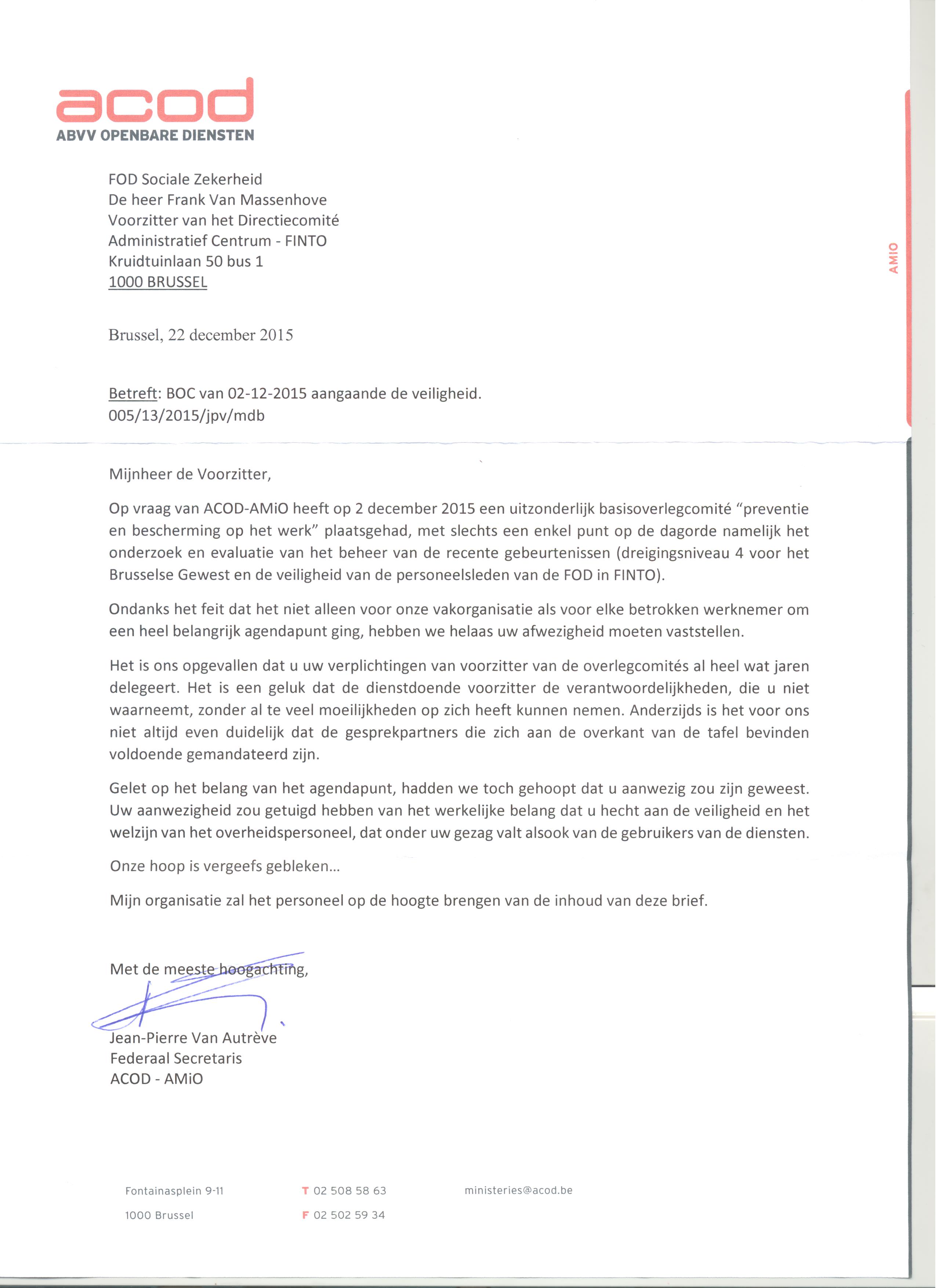 De ACOD liet me per brief weten diep ontgoocheld te zijn over mijn afwezigheid op een uitzonderlijk basiscomité met als enig agendapunt de terreurdreiging en de gevolgen voor de personeelsleden. De vergaderingen van het basiscomité worden in onze FOD al jaren voorgezeten door onze personeelsdirecteur. Maar nu was omwille van de belangrijkheid van het agendapunt mijn aanwezigheid opeens broodnodig. Ongetwijfeld zou ik met mijn onmetelijke wijsheid onmiddellijk geweten hebben hoe de terreur een dodelijke slag kon toegebracht worden. Vroeger dacht ik dat telkens als het ACOD me een farao noemde, dat spottend bedoeld was maar blijkbaar geloven ze echt in mijn wonderlijke krachten. Jean-Claude Heirman, die de vergadering voorzat, was niet alleen perfect gemandateerd – dat iemand die namens het directiecomité op een vergadering zit altijd een mandaat heeft is iets wat het ACOD na al die jaren blijkbaar niet kan begrijpen – maar is ook deskundiger dan ik in dat soort zaken.